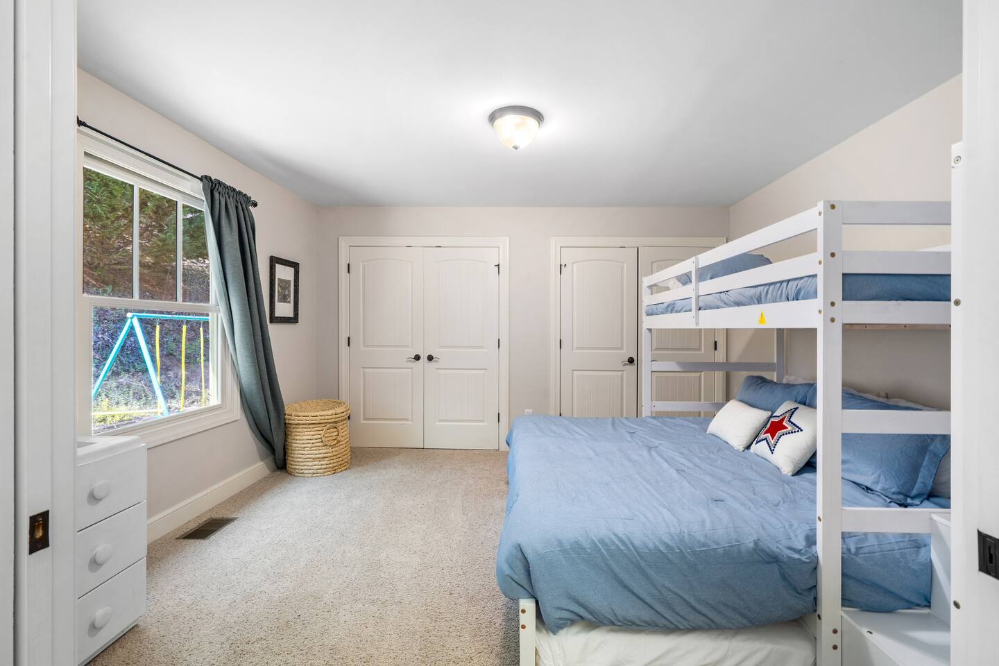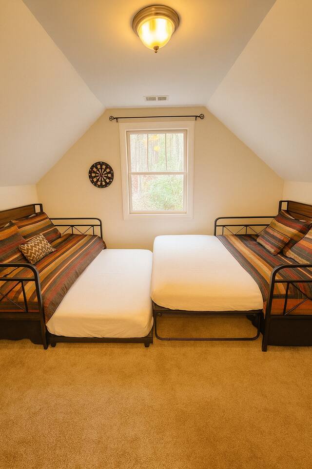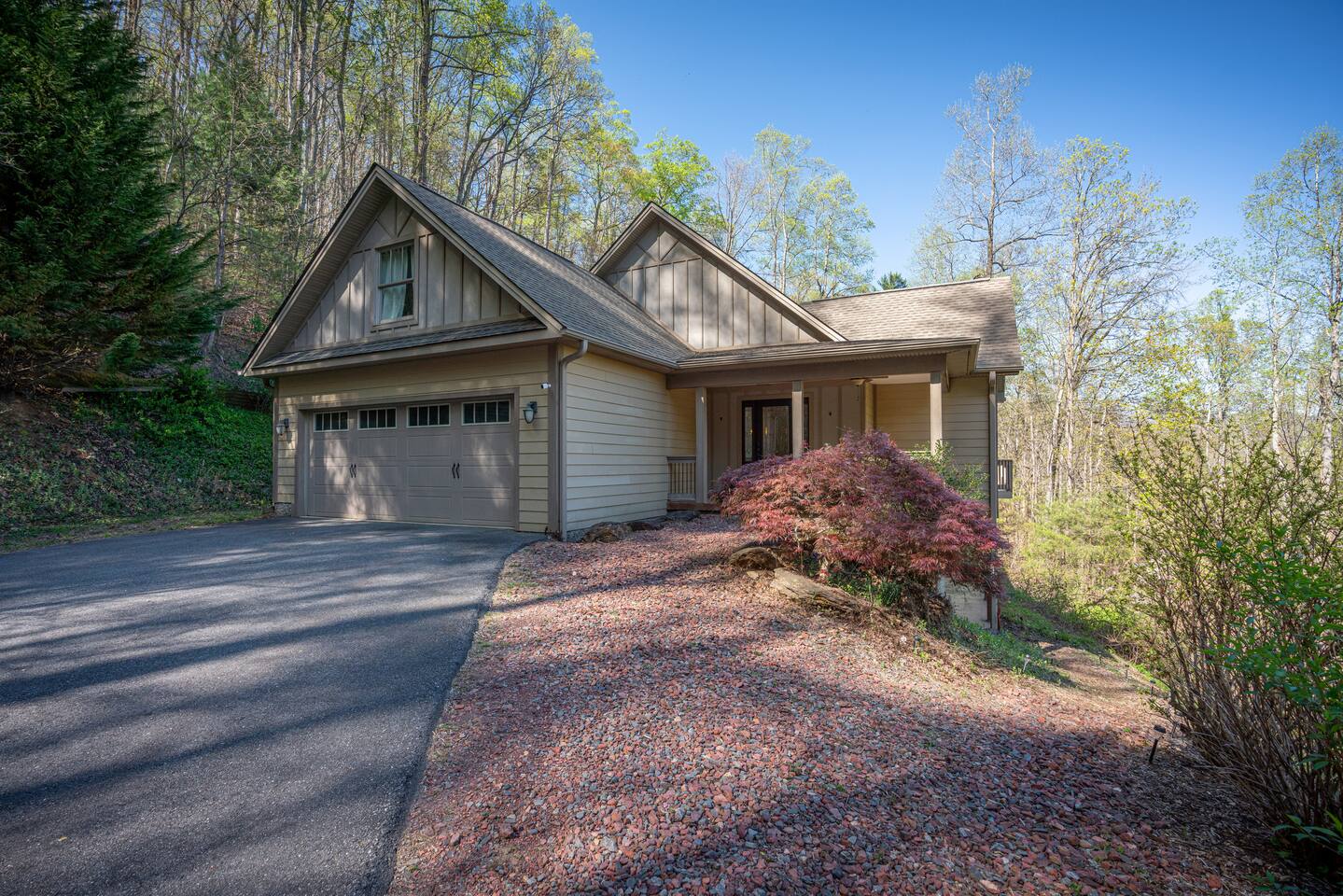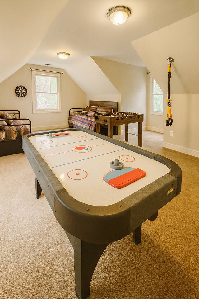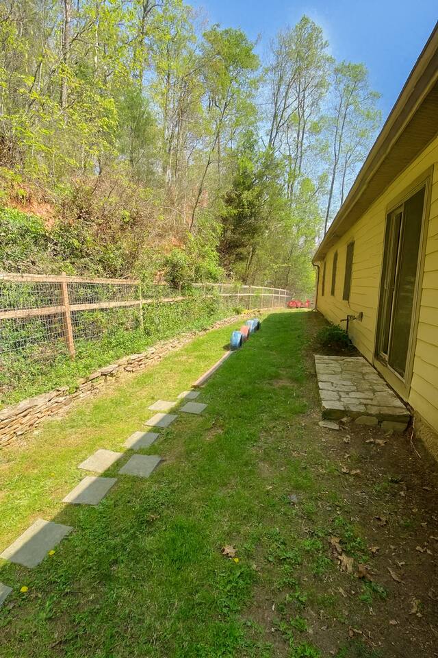 Luxurious, privacy in quiet, convenient East Asheville. Enjoy our secluded mountain home with the convenience of being less than 15 minute from downtown Asheville and 20 minutes from Black Mountain. Relax on the cozy Arhaus sectional with ample room for everyone in your party while looking out the almost floor to ceiling windows. Enjoy meals in the dinning room with wonderful views of the lush foliage (or partial mountain views in winter). There is a well-stocked kitchen that we aim to keep stocked with the supplies you are used to at home to make a quick or luxurious meal without the stress of missing ingredients or kitchen items. On the main floor, there is the master bedroom with a king bed, an en suite bathroom with a jetted tub to unwind in at the end of the day, and a walk-in closet. The 2nd bedroom with playroom is also on the main floor. This room has a twin over king bunk with twin trundle and a pull out sofa bed in the adjoining play-room. Please note, the top twin has a weight limit of 200lbs, and the bottom. Trundle has a limit of 150lbs. Both would be more suitable for children rather then adults. There is also a second bathroom with a shower/tub on this level. There is a door on the main floor to separate/block the stairwell to the downstairs for childproofing (or privacy) if desired. The downstairs suite can offer privacy to older kids (or parents) or to another family. There is a queen bedroom with sitting area and as well as a king bedroom with a small kitchenette set-up (mini fridge, keurig, microwave, toaster). The downstairs also has a luxurious bathroom with a shower and two separate sink areas as well as a walk-in closet. Outside there is a home-made play set-up (see pictures) and propane fire pit to roast marshmallows with ease. While you can have a peak of blue ridge mountains in summer, winter does afford a lovely Mountain View. Fenced backyard for kids or pups (updated pictures soon). We are happy to provide a pack and play with a sheet, umbrella and running strollers, high chair, booster seat chair, kids dishes, and lots of toys and books. We have a level 2 EV charger in the garage. Tesla owners, bring your own converter! In winter, four wheel drive is recommended in case of any snow. In case of heavy snow, which is very rare, driveway may not be navigable as it is quite steep. Will have to park at bottom of driveway and walk down to car. The room above the garage will be locked for owner storage. Please do note that there may be some small changes in decor and furniture as we replace items when they have too much wear and tear. Just like for anywhere in the Asheville area, there may be native animals, including bears, on the property - They even walk through the downtown on occasion!