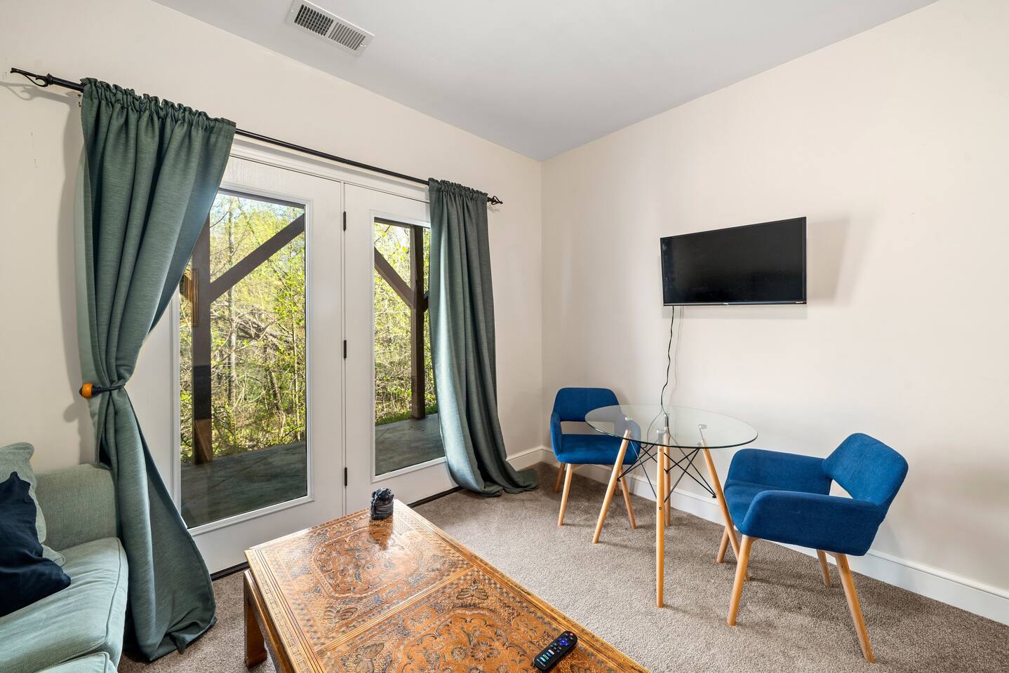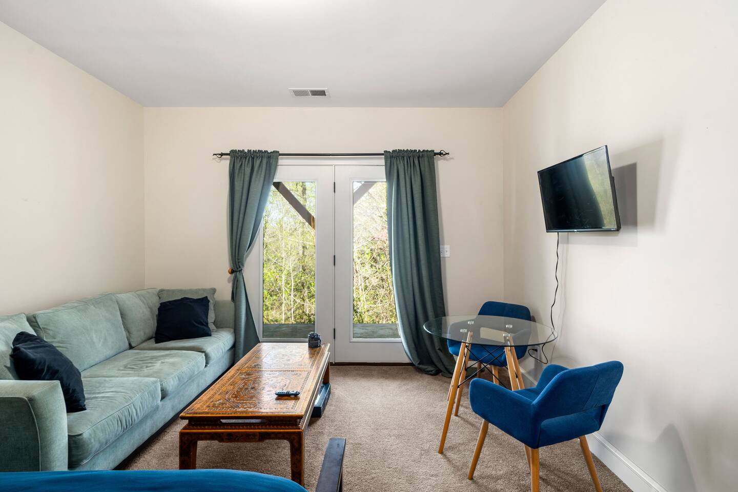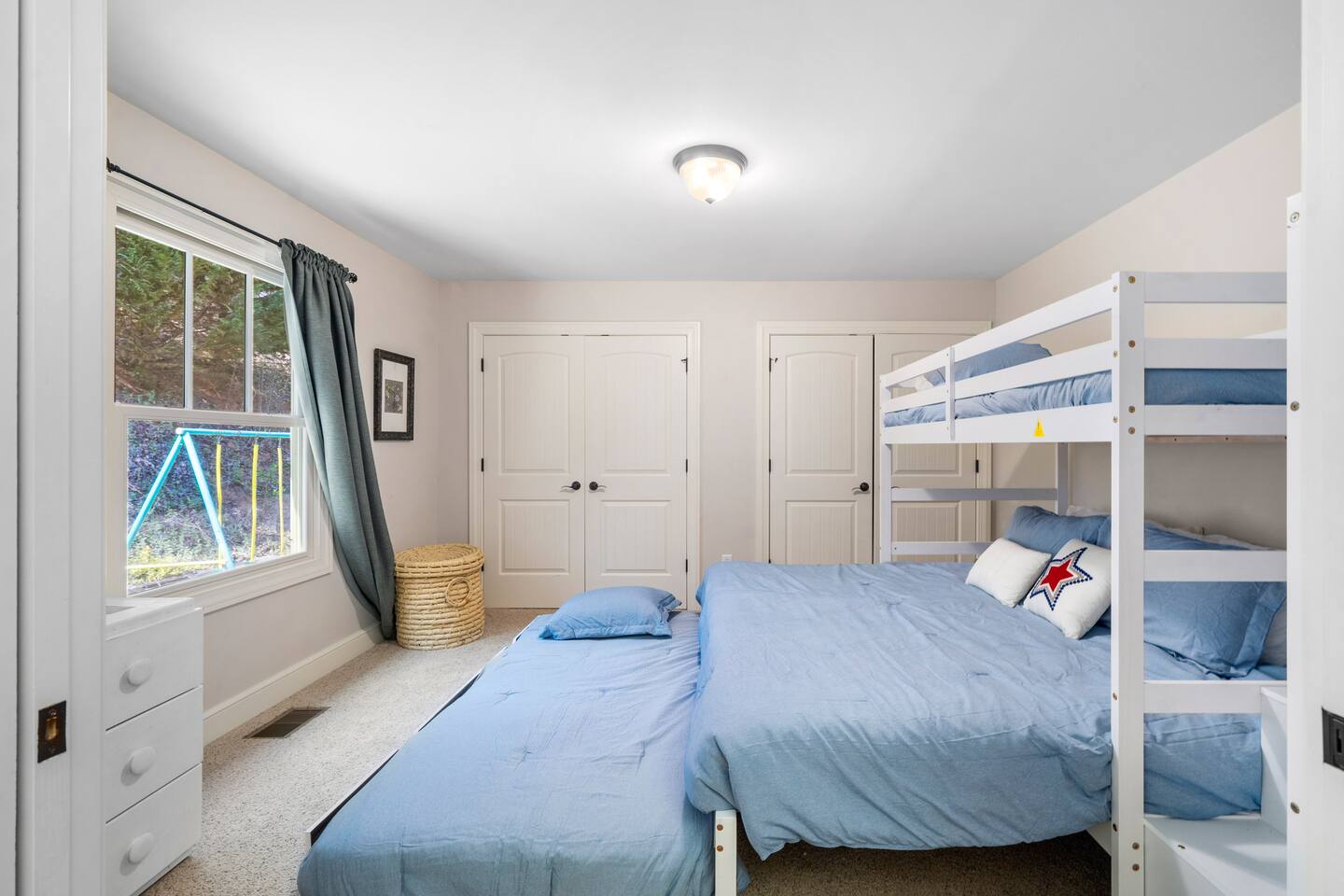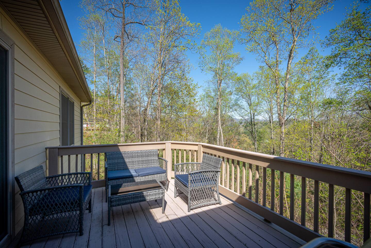 Luxurious, privacy in quiet, convenient East Asheville. Enjoy our secluded mountain home with the convenience of being less than 15 minute from downtown Asheville and 20 minutes from Black Mountain. Relax on the cozy Arhaus sectional with ample room for everyone in your party while looking out the almost floor to ceiling windows. Enjoy meals in the dinning room with wonderful views of the lush foliage (or partial mountain views in winter). There is a well-stocked kitchen that we aim to keep stocked with the supplies you are used to at home to make a quick or luxurious meal without the stress of missing ingredients or kitchen items. On the main floor, there is the master bedroom with a king bed, an en suite bathroom with a jetted tub to unwind in at the end of the day, and a walk-in closet. The 2nd bedroom with playroom is also on the main floor. This room has a twin over king bunk with twin trundle and a pull out sofa bed in the adjoining play-room. Please note, the top twin has a weight limit of 200lbs, and the bottom. Trundle has a limit of 150lbs. Both would be more suitable for children rather then adults. There is also a second bathroom with a shower/tub on this level. There is a door on the main floor to separate/block the stairwell to the downstairs for childproofing (or privacy) if desired. The downstairs suite can offer privacy to older kids (or parents) or to another family. There is a queen bedroom with sitting area and as well as a king bedroom with a small kitchenette set-up (mini fridge, keurig, microwave, toaster). The downstairs also has a luxurious bathroom with a shower and two separate sink areas as well as a walk-in closet. Outside there is a home-made play set-up (see pictures) and propane fire pit to roast marshmallows with ease. While you can have a peak of blue ridge mountains in summer, winter does afford a lovely Mountain View. Fenced backyard for kids or pups (updated pictures soon). We are happy to provide a pack and play with a sheet, umbrella and running strollers, high chair, booster seat chair, kids dishes, and lots of toys and books. We have a level 2 EV charger in the garage. Tesla owners, bring your own converter! In winter, four wheel drive is recommended in case of any snow. In case of heavy snow, which is very rare, driveway may not be navigable as it is quite steep. Will have to park at bottom of driveway and walk down to car. The room above the garage will be locked for owner storage. Please do note that there may be some small changes in decor and furniture as we replace items when they have too much wear and tear. Just like for anywhere in the Asheville area, there may be native animals, including bears, on the property - They even walk through the downtown on occasion!